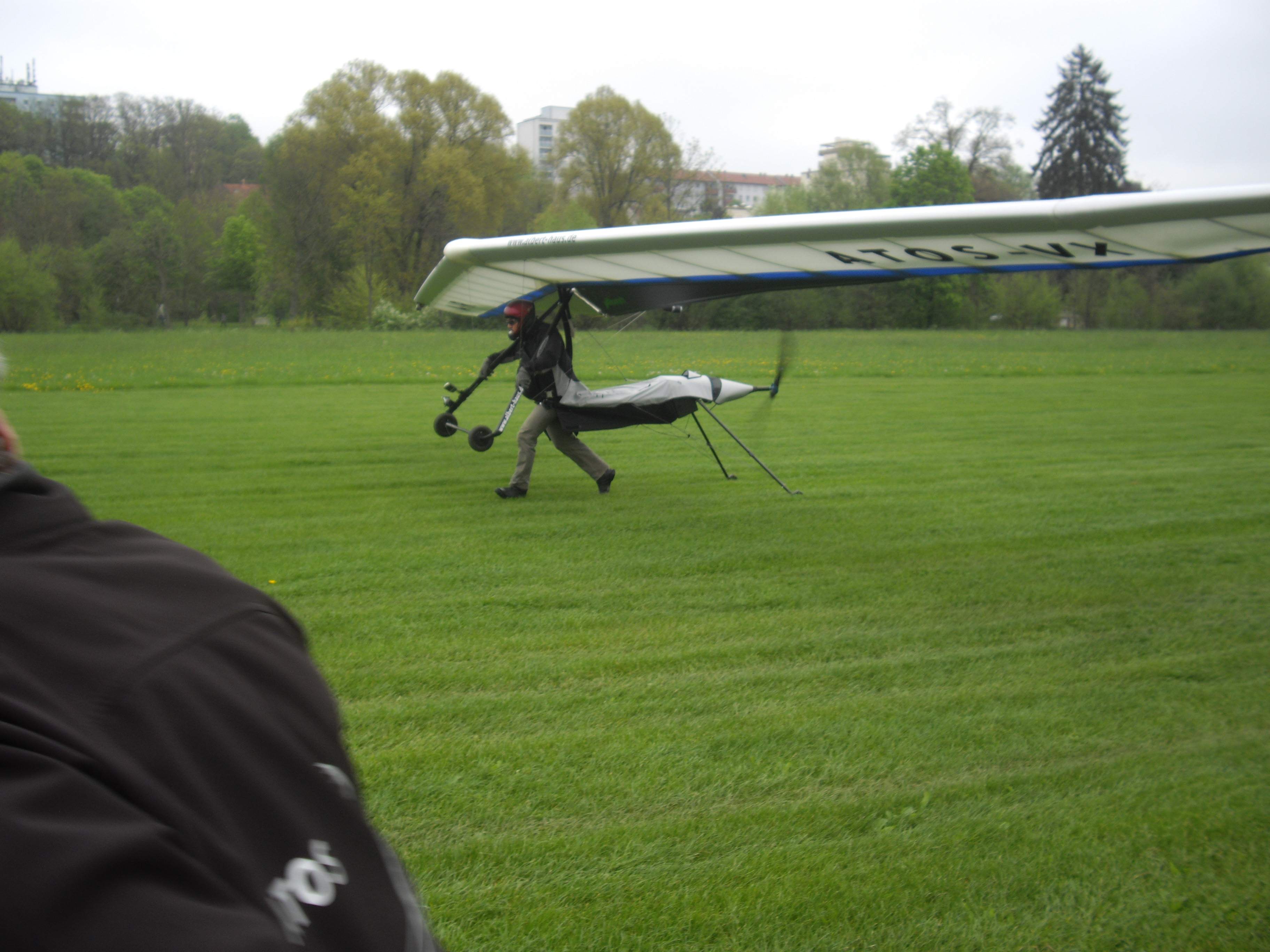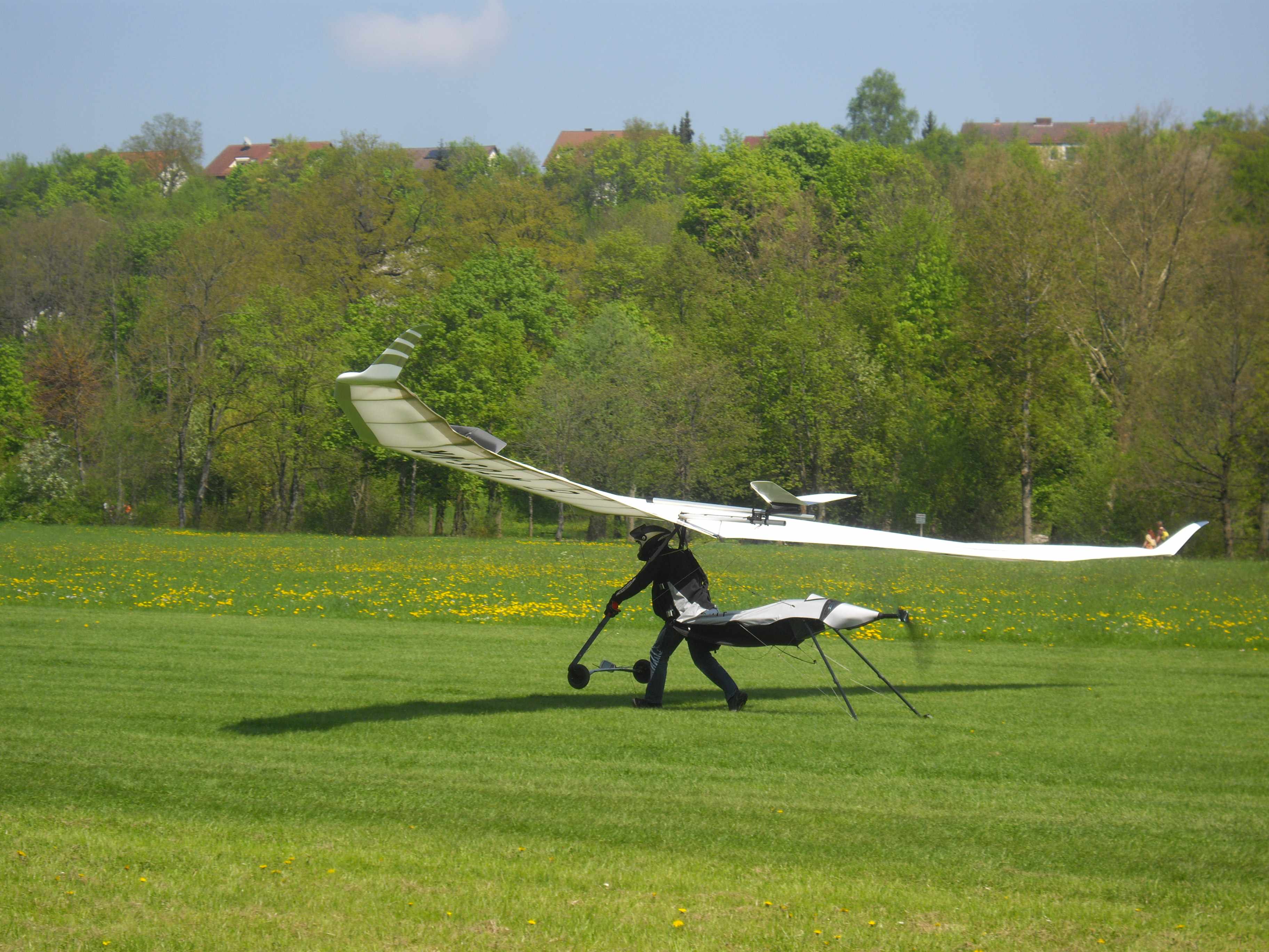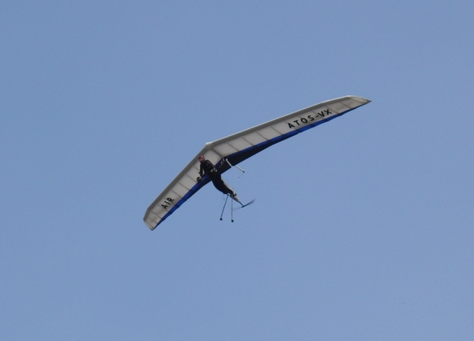 An das Bodenhandling mit den Stützen muss man sich etwas gewöhnen, ist aber schnell erlernt. Der Start ist dafür dann besonders einfach. Man gibt Vollgas (bzw. "Vollstrom...") und ab geht die Post. Nach wenigen Schritten schiebt einen der Elift in die Luft. Dabei hat mich erstaunt, wieviel Power der Elektroantrieb bringt. Man muss deutlich weniger laufen, als beim Mosquito. Hier Norbert bei einem E-Power-Start.