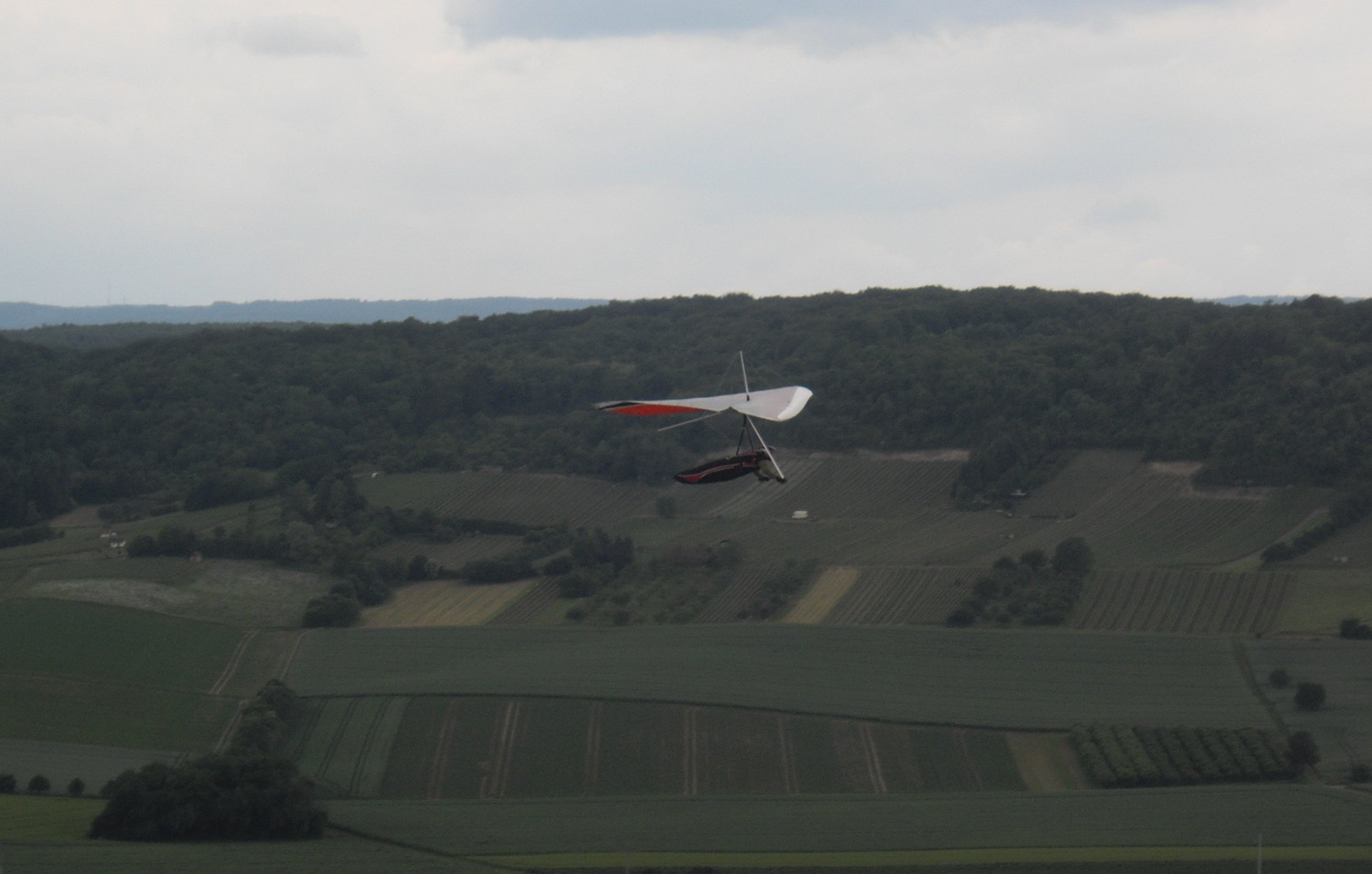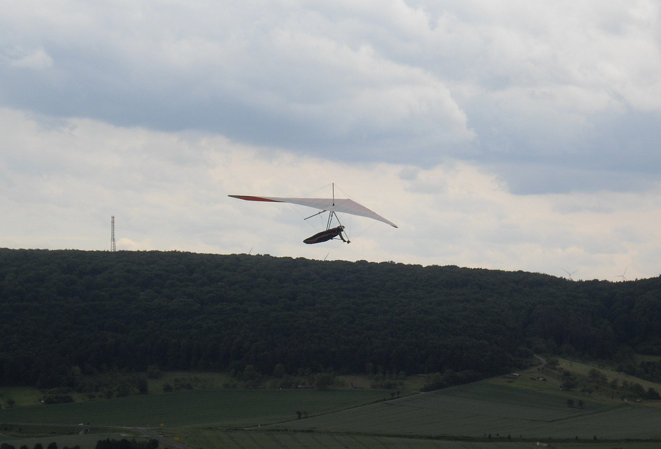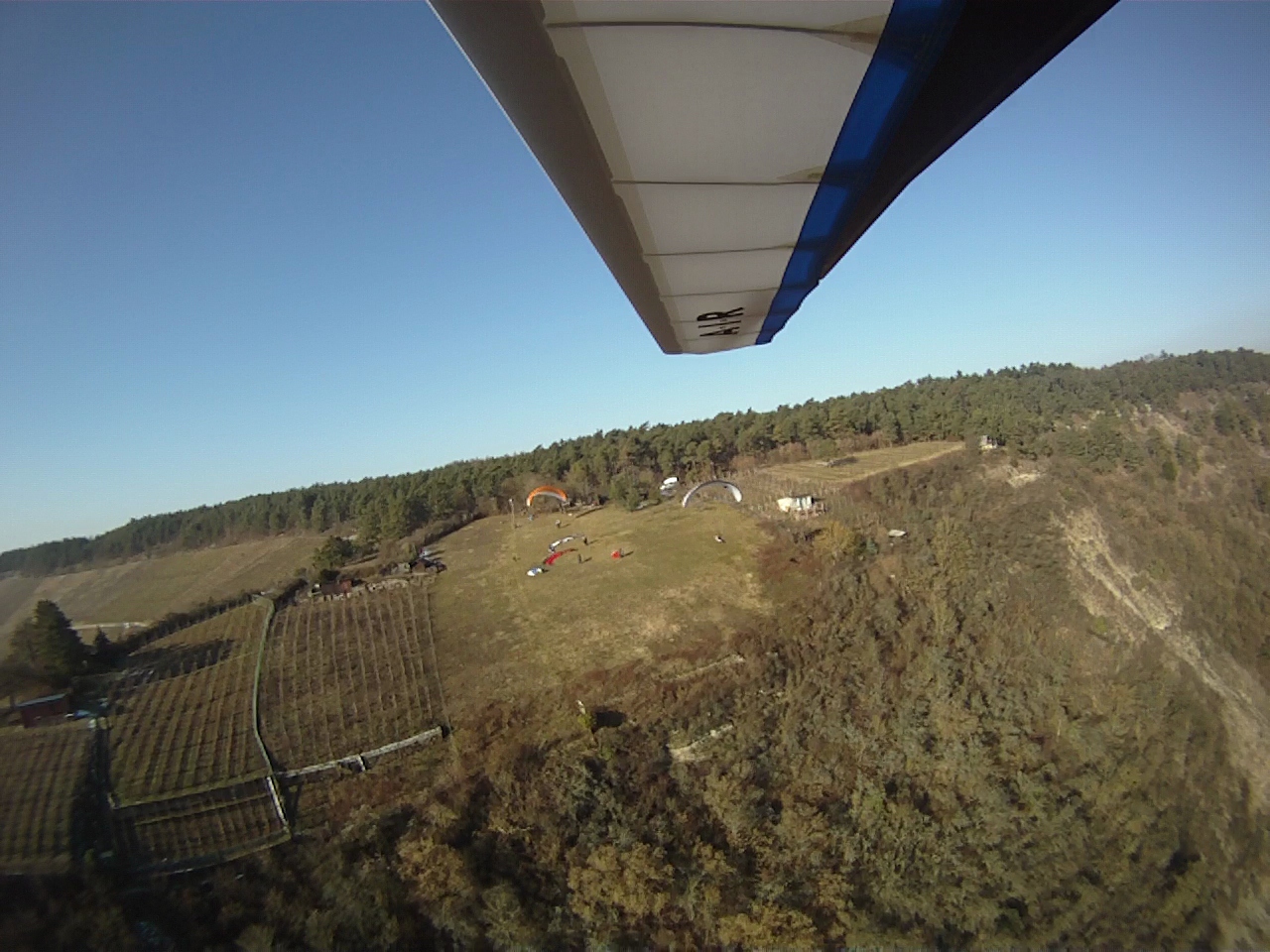 Recht unvermittelt, so wie man den Edelweiß halt so kennt, frischte der Wind kurz darauf auf und es blies nun recht ordentlich. Meist zu zwischen 25-30 kmh und bei Ablösungen deutlich drüber. Zügig waren die meisten Drachen in der Luft, auch unsere Neuen hatten viel Spaß und ordentlich Flugzeit, und die ersten Clubmitglieder versuchten sich mit einer kleinen Strecke, auch wenn das mit der teils zerrissenen Thermik nicht so einfach war. Norbert schaffte es bis nach Meiningen (Glückwunsch!). Später legte der Wind in der Höhe nochmals zu, die Segelflieger sprachen von bis 70 kmh, was auch erklärte, warum ich selbst mit dem Atos VR etwas Mühe hatte, aus 1600m gegen den Wind wieder von Gössenheim nach Gambach zu kommen.